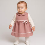 Un outfit raffinato e confortevole, composto da abito senza maniche e maglia a maniche lunghe in caldo cotone, pensato per garantire stile ed eleganza senza rinunciare alla comodità. L’abitino è arricchito da colletto arrotondato, fiocchetto in vita e bordino decorativo sull’orlo, mentre la maglia in caldo cotone assicura morbidezza e calore, perfetta per la pelle delicata della neonata.