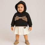 • Felpa nera con cappuccio, realizzata in tessuto caldo e morbido, arricchita da un maxi fiocco in fantasia animalier leopardata.