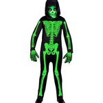 Costume spaventoso perfetto per Halloween, feste a tema e spettacoli. Realizzato in tessuto nero con stampa scheletro bianca su tutta la superficie, include tuta intera con cappuccio e guanti stampati integrati. Facile da indossare e molto scenografico.