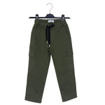 Pantalone Cargo Bimbo Verde Militare Pantalone dal taglio cargo realizzato in cotone resistente e confortevole. Dotato di elastico in vita con coulisse regolabile, tasche laterali e pratiche tasche cargo con patta. Il design moderno e funzionale lo rende perfetto per un look casual e dinamico, ideale per la scuola e il tempo libero.