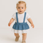 • Design: Salopette in jeans con dettagli curati, t-shirt a mezza manica abbinata