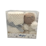 Set composto da una morbida copertina in pile e un tenero pupazzo abbinato, firmati Mafer. Un'idea regalo dolce e funzionale, confezionata in elegante scatola. La copertina, ideale per passeggino e culletta, è decorata con un delicato motivo a stelle e misura 70x90 cm. Il peluche, soffice e coccoloso, accompagna il bambino nei suoi momenti di relax.
