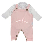Completo neonato del marchio Melanie, disponibile nelle taglie 1-3 e 3-6 mesi. Realizzato in morbido tessuto acrilico, è composto da salopette lavorata a maglia con dettagli raffinati e bottoncini pratici, abbinata a un bodino a maniche lunghe in cotone. Confezionato in elegante scatola, è una scelta ideale per corredino o come idea regalo.