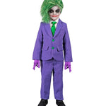 Costume a tema perfetto per Carnevale, feste in maschera e Halloween. Composto da giacca viola a righe con bottoni verdi e pantaloni coordinati. Ideale per travestirsi da piccolo villain con un look divertente e originale.