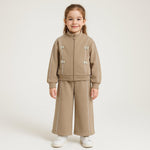 Un completo pratico e raffinato composto da giacca con zip frontale e pantalone ampio a gamba dritta. La giacca è arricchita da eleganti dettagli con fiocchetti applicati e profili a contrasto, mentre il pantalone presenta la stessa linea decorativa per un look coordinato e moderno. Realizzata in tessuti morbidi e confortevoli, questa tuta è perfetta per il tempo libero e le uscite quotidiane.