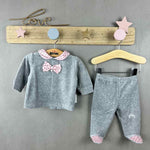 tutina 2 Pezzi Clinico melanie di ciniglia taglie: 0/3 mesi 3/6 mesi 6/9 mesi composizione: 80% cotone 20%poliestere lavare delicatamente max 40° non trattare con cloro – evitare l’asciugatrice – stirare a temperatura max 110° non lavare a secco – lavare e stirare al rovescio